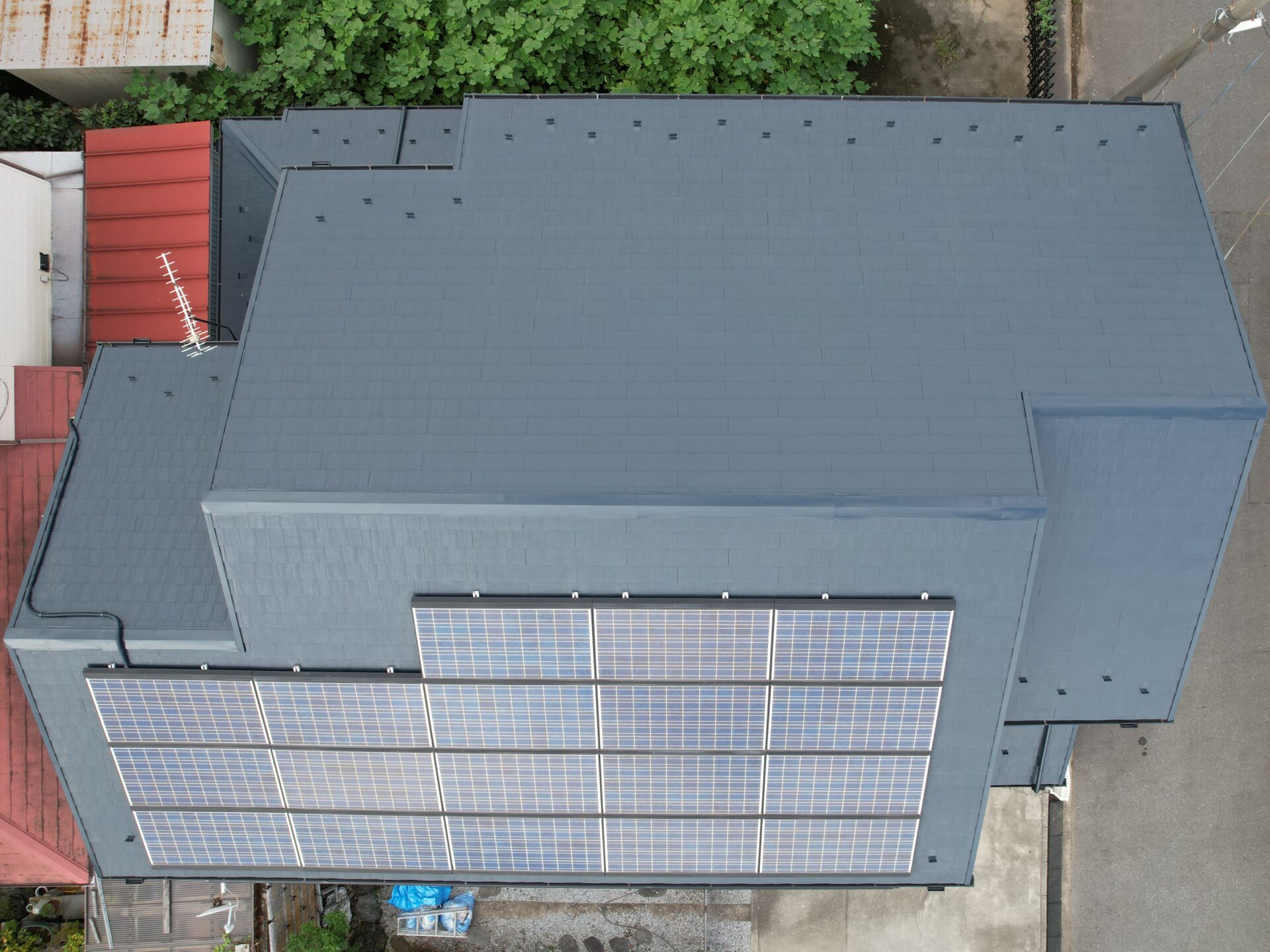 | 使用材料 | 屋根下塗:PLスーパーハイブリットバインダーSi2(N-85)、屋根中上塗:無機ハイブリッドチタンガードルーフ(PL-47)、外壁下塗:PLスーパーファインベース、外壁中上塗:無機ハイブリッドチタンガードアクア(PL-31)、付帯部塗装:レガロ(PL-47) |