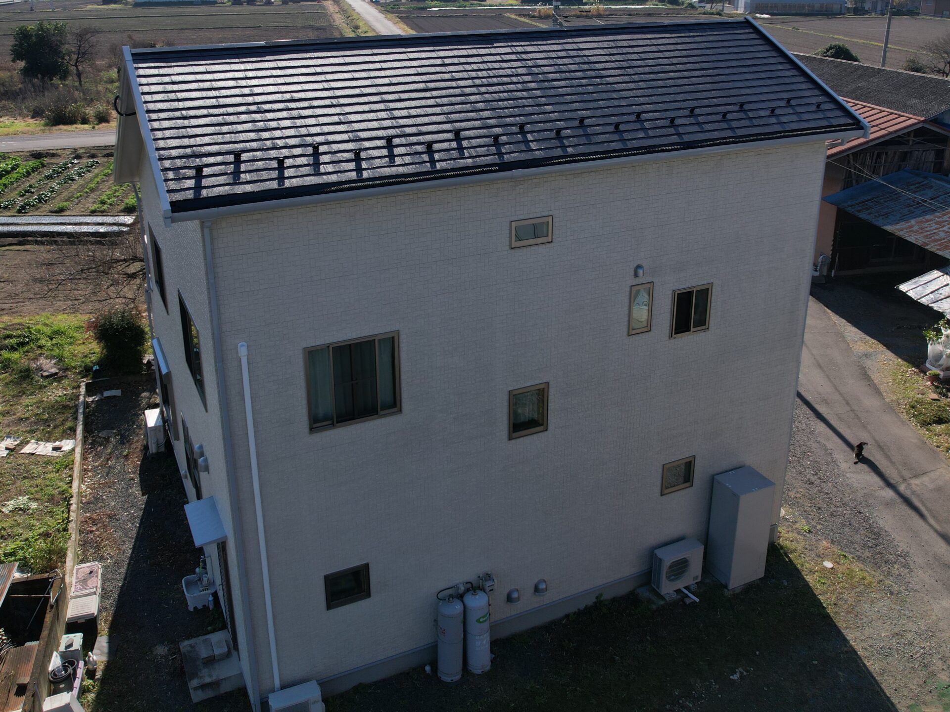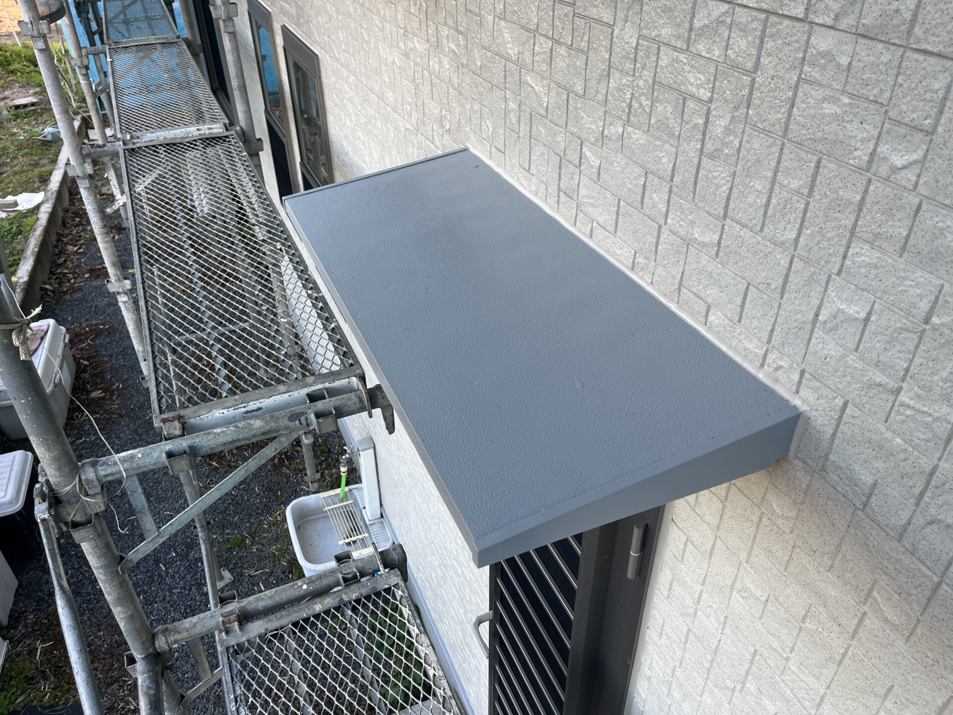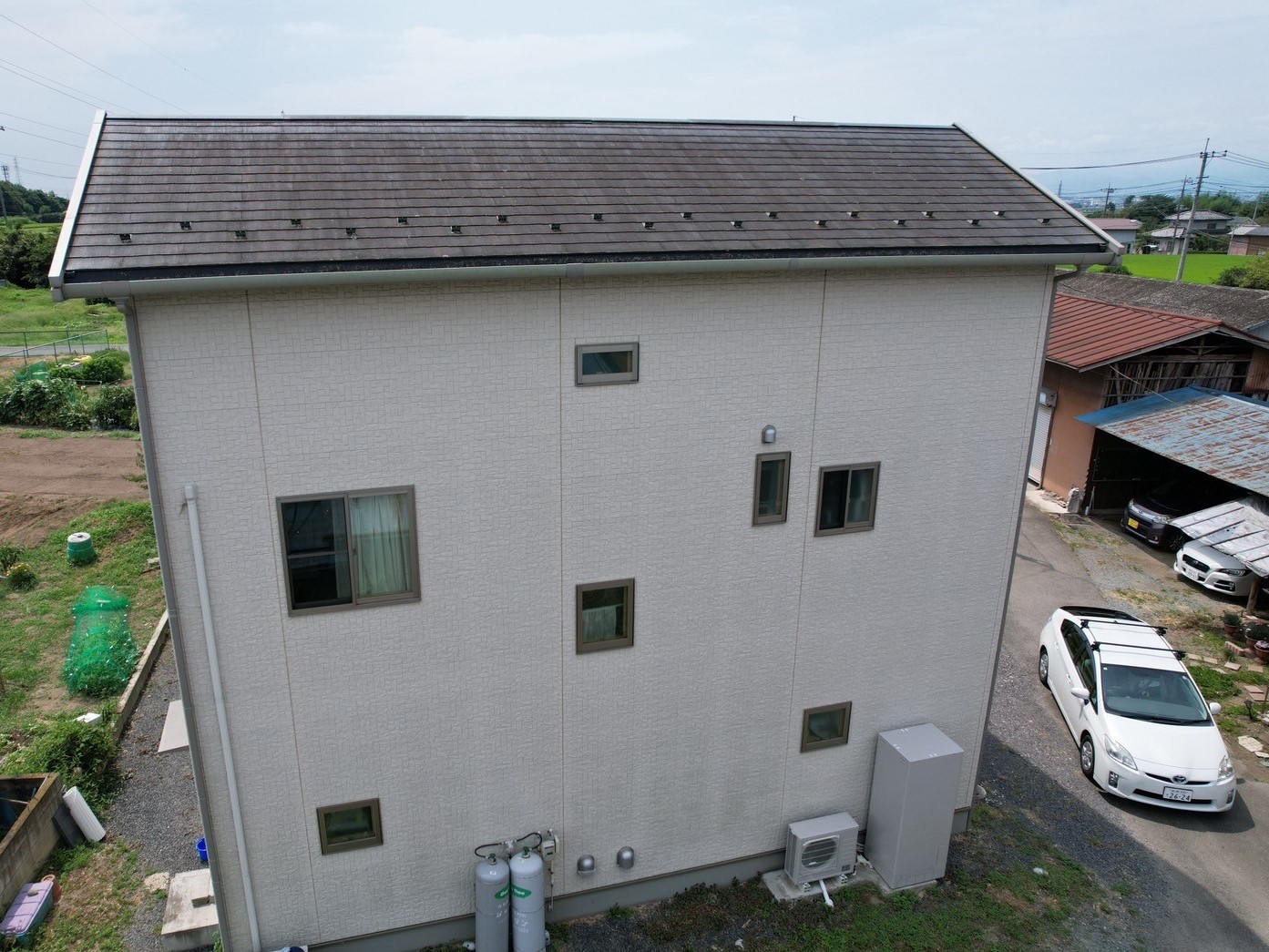 | 使用材料 | 外壁下塗:PLスーパーハイブリッドバインダーSi2(クリヤー)、外壁中上塗:無機ハイブリッドチタンガードアクア(クリヤー)、屋根下塗:PLスーパーハイブリッドバインダーSi2(N-85)、屋根中上塗:無機ハイブリッドチタンガードルーフ(PL-48)、付帯部塗装:レガロ(PL-03、PL-01)、ベランダ床:オートンウレアックス(グレー) |